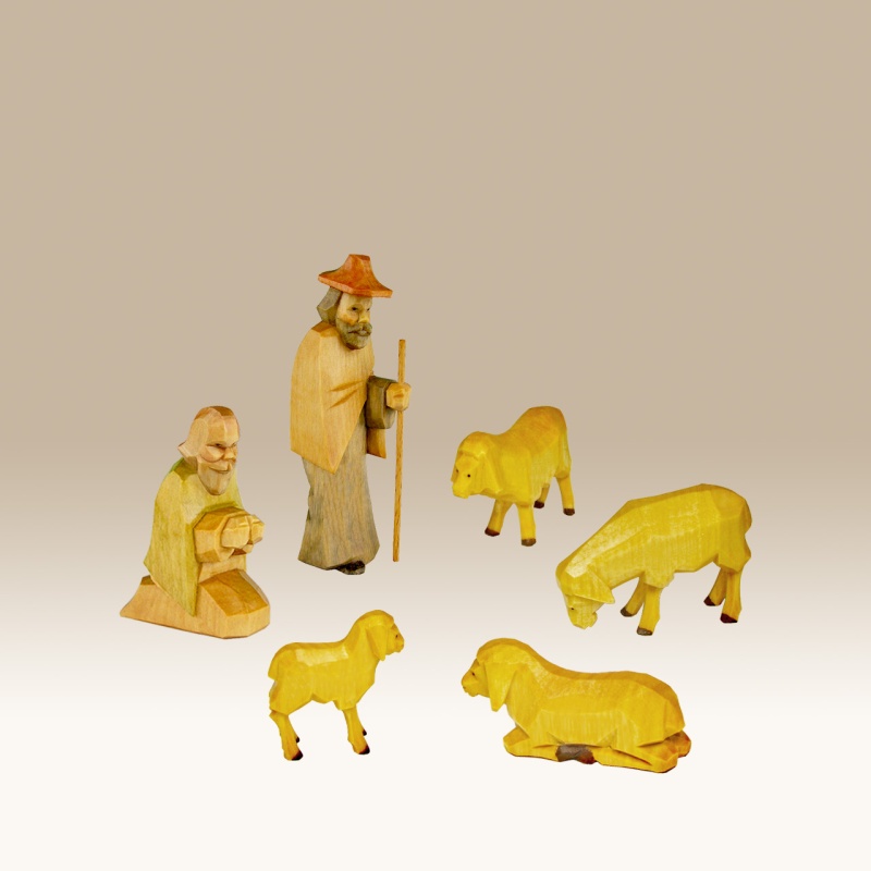 Die Figuren sind handgeschnitzt und farbig lasiert. Dadurch ist die Maserung des Holzes noch gut sichtbar.