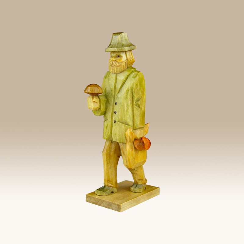 Die Figur ist handgeschnitzt und farbig lasiert. Dadurch ist die Maserung des Holzes noch gut sichtbar.