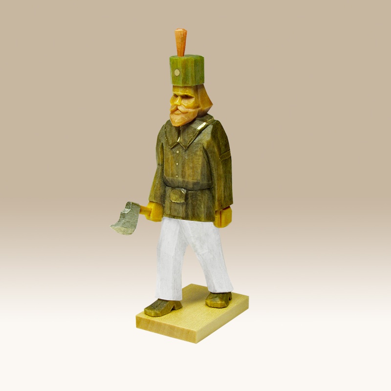 Die Figur ist handgeschnitzt und farbig lasiert. Dadurch ist die Maserung des Holzes noch gut sichtbar.