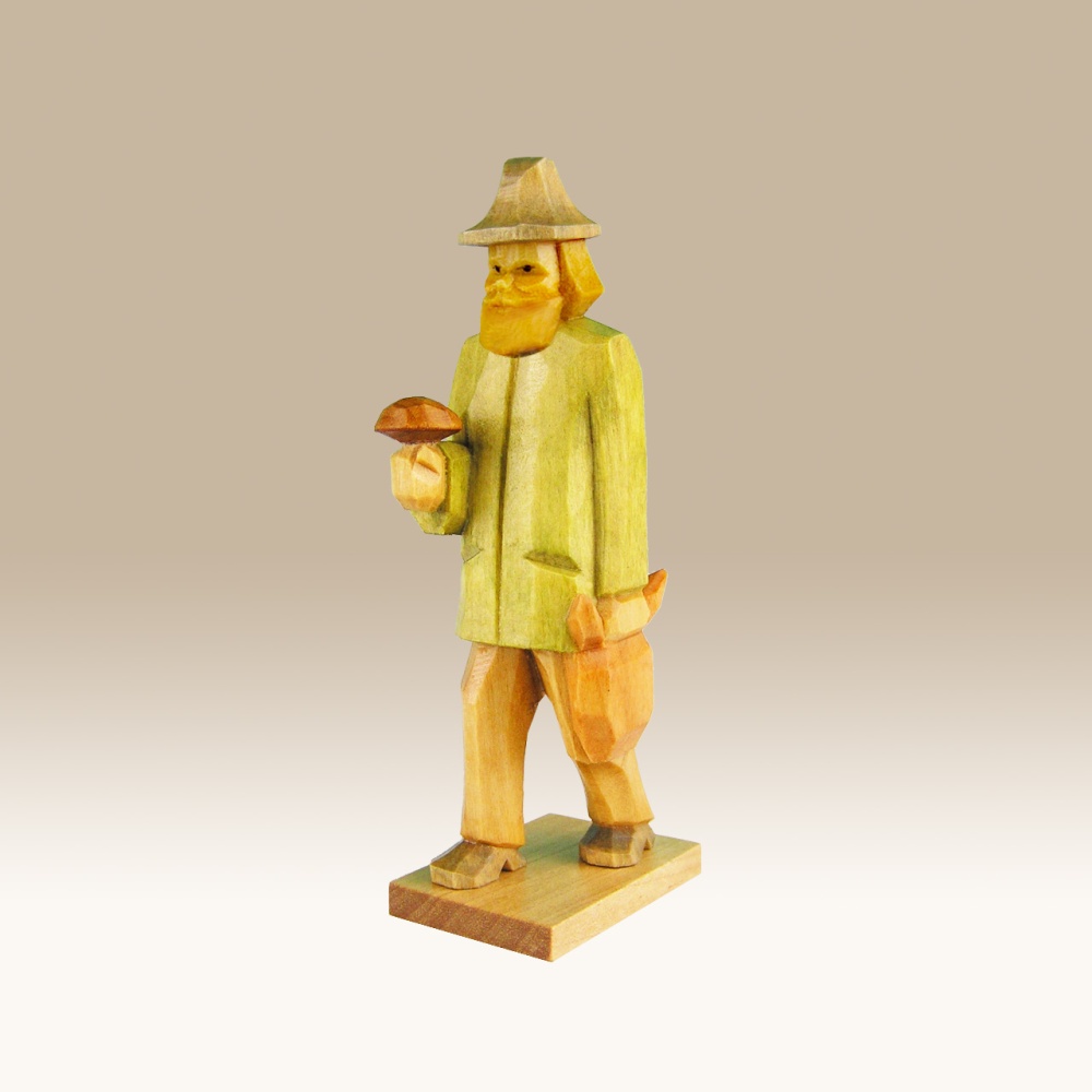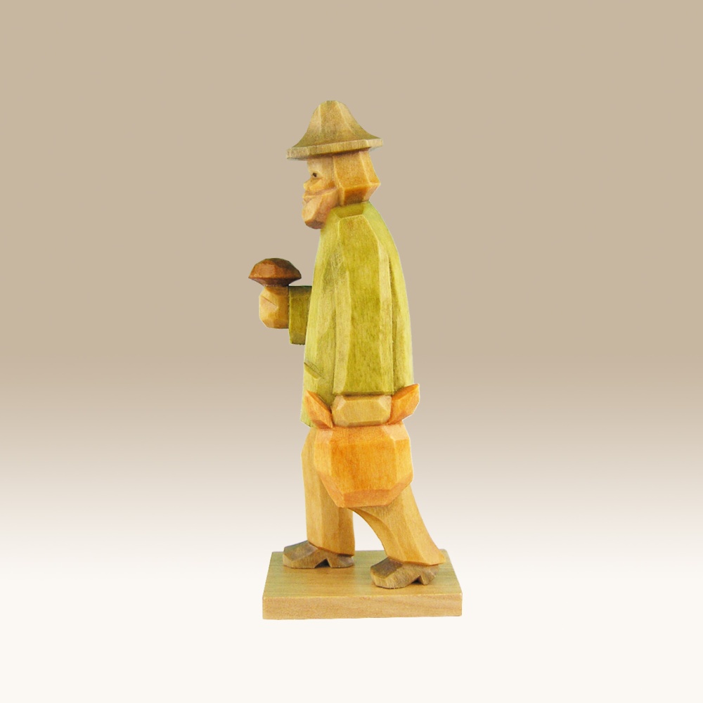 Die Figur ist handgeschnitzt und farbig lasiert. Dadurch ist die Maserung des Holzes noch gut sichtbar.