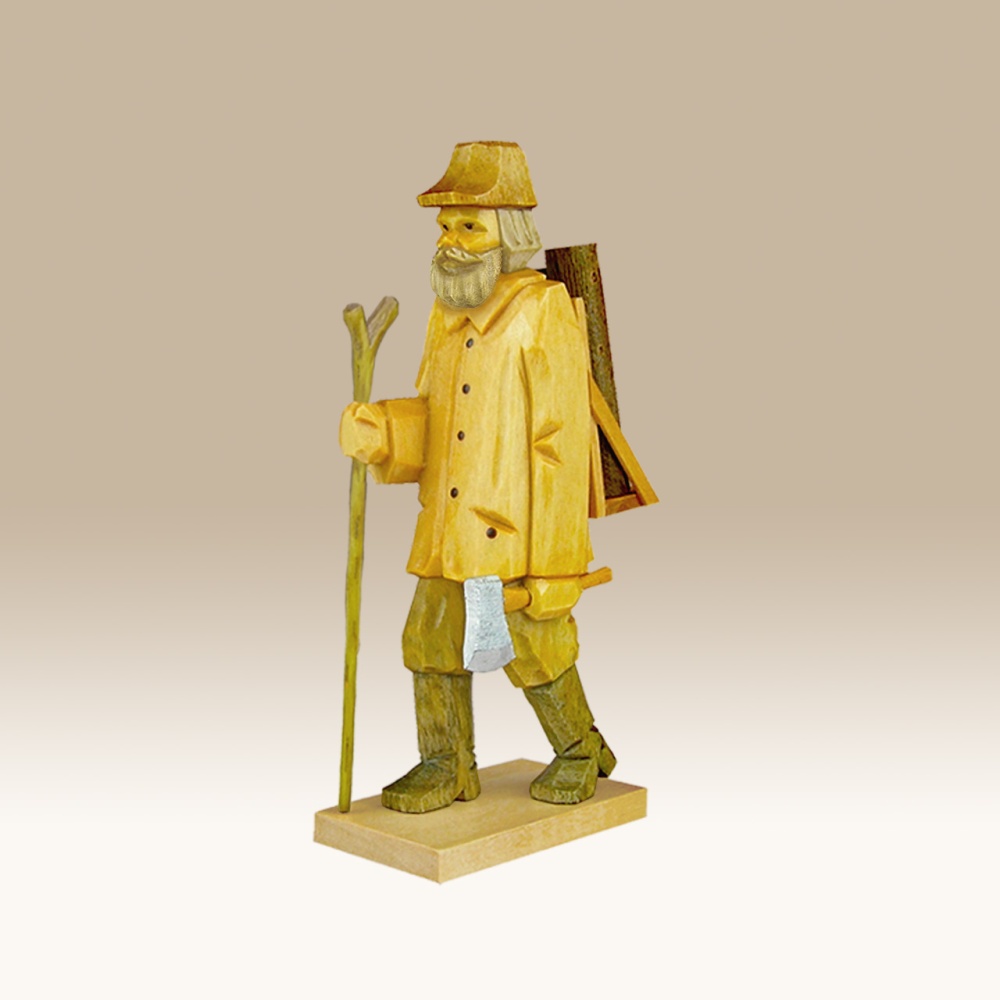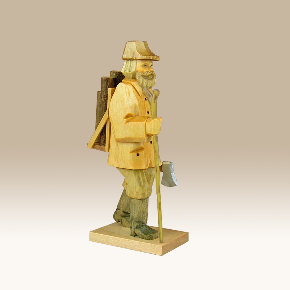 Die Figur ist handgeschnitzt und farbig lasiert. Dadurch ist die Maserung des Holzes noch gut sichtbar.