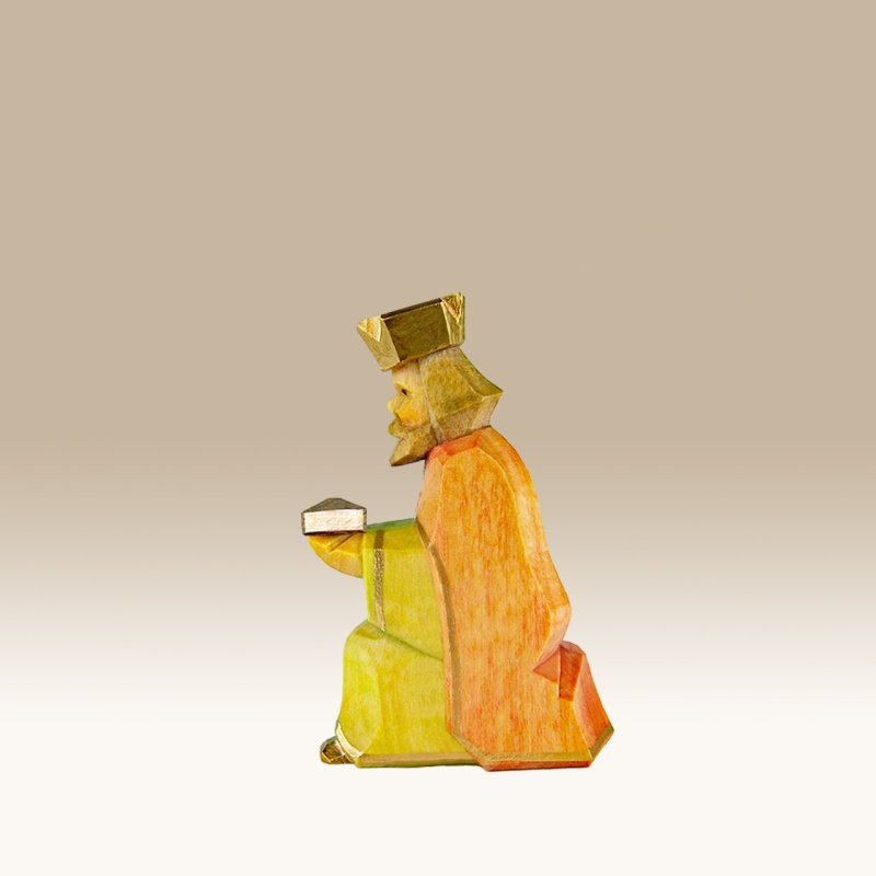 Die Figur ist handgeschnitzt und farbig lasiert. Dadurch ist die Maserung des Holzes noch gut sichtbar.