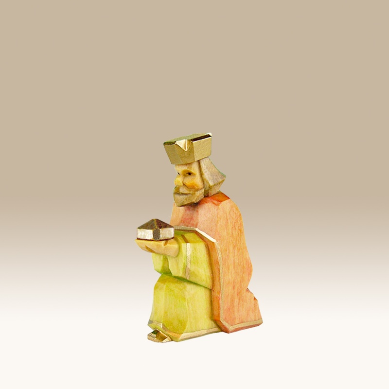Die Figur ist handgeschnitzt und farbig lasiert. Dadurch ist die Maserung des Holzes noch gut sichtbar.