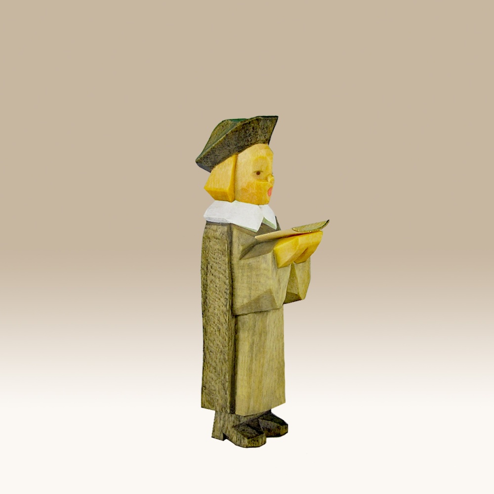 Die Figur ist handgeschnitzt und farbig lasiert. Dadurch ist die Maserung des Holzes noch gut sichtbar.