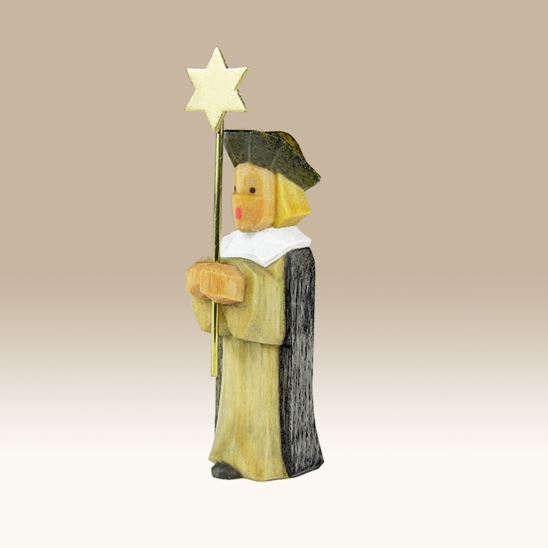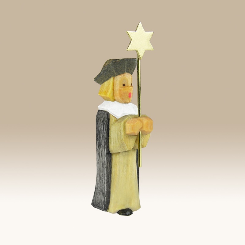 Die Figur ist handgeschnitzt und farbig lasiert. Dadurch ist die Maserung des Holzes noch gut sichtbar.