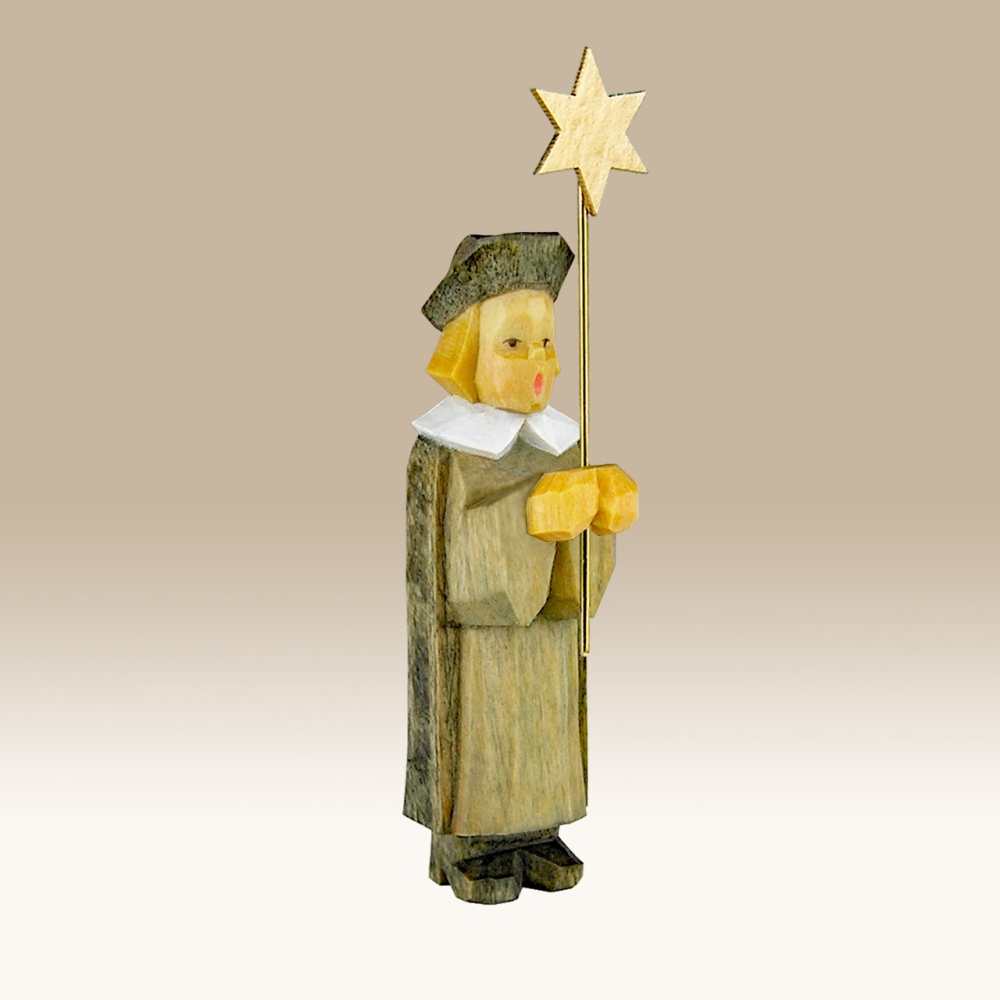 Die Figur ist handgeschnitzt und farbig lasiert. Dadurch ist die Maserung des Holzes noch gut sichtbar.
