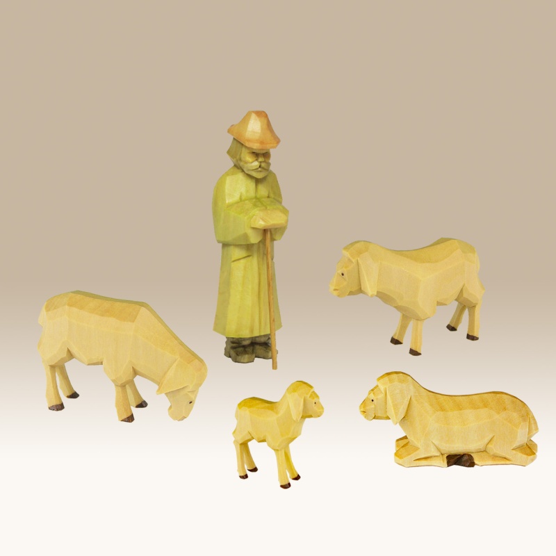 Die Figuren sind handgeschnitzt und farbig lasiert. Dadurch ist die Maserung des Holzes noch gut sichtbar.
